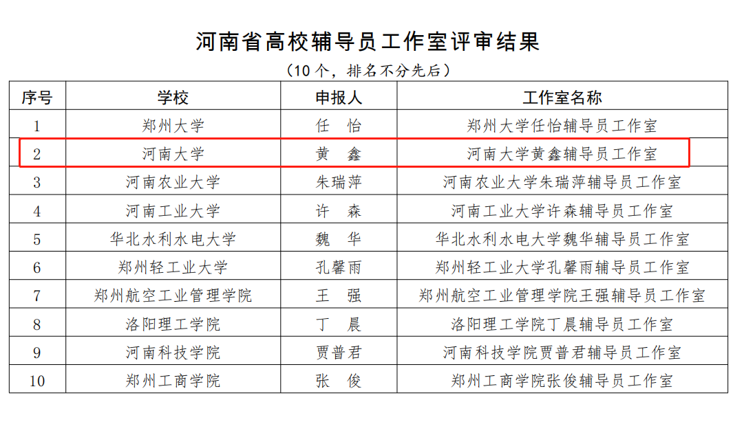 近日,河南省委教育工委、河南省教育廳公布《關(guān)于河南省高校輔導員工作室評審結(jié)果的公示》,我校黨委學生工作部組織申報的“河南大學黃鑫輔導員工作室”榜上有名。此次評選活動自今年7月啟動,經(jīng)各高校申報、資格審查、專家評審、綜合評議等環(huán)節(jié),評選出10個河南省高校輔導員工作室。