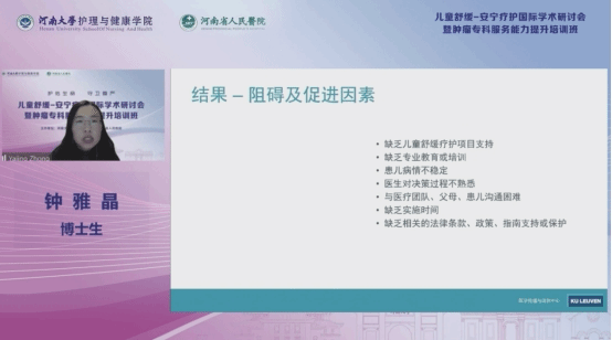 資深兒童安寧療護教育講師Amy Haskamp教授作《兒童舒緩療護模式簡介》報告,她從兒童健康照護的發(fā)展歷史講到重癥患兒照護的倫理問題,提出舒緩療護和臨終關懷的區(qū)別與聯系和如今兒童舒緩療護的理念和目標,她還分享《兒童舒緩療護相關倫理及法律問題》《兒童舒緩療護中的癥狀管理》《親人離世后的哀痛輔導》等專題內容;波士頓學院康乃爾護理學院臨床教授Vanessa Battista作《圍產期及新生兒的舒緩療護》《兒童疼痛管理》《溝通》《患兒離世前期的照護》等四篇報告;北京大學護理學院孫宏玉教授作《護理學專業(yè)人才培養(yǎng)中人文關懷的重要性》報告,提出要重視護理專業(yè)人文關懷能力的培養(yǎng);中南大學湘雅護理學院院長唐四元教授以《兒童居家安寧療護發(fā)展》為題,介紹兒童居家安寧療護的定義和優(yōu)勢,為兒童安寧療護更好地發(fā)展指明方向;天津醫(yī)科大學護理學院黨委書記趙岳教授在《孤獨癥譜系障礙兒童的健康管理》報告中講述我國孤獨癥兒童的服務情況和孤獨癥的病因與臨床表現,提出治療原則與方法;大連大學護理學院院長安力彬教授以《兒童護理人文關懷》為主題介紹兒童護理的重要性,講述兒童護理與人文關懷的技巧;蘇州大學醫(yī)學院護理學院院長李惠玲教授在《兒童舒緩與安寧療護敘事》中闡述兒童安寧療護的核心和具體方法;首都醫(yī)科大學副教授岳鵬以《兒童緩和醫(yī)療中的家庭會議》為題,闡述兒童緩和醫(yī)療中的家庭會議的未來發(fā)展方向;美國伯明翰大學護理與助產學院副教授郭平作《舒緩醫(yī)療在全球范圍內的發(fā)展及應用》的演講,講述舒緩醫(yī)療在全球的的發(fā)展與應用;鄭州第九人民醫(yī)院副院長李玲作《安寧療護中的兒童服務實踐》報告,深入講解了人為關懷在兒童姑息治療與安寧療護的治療建議;首都醫(yī)科大學副教授周翾的《介紹國內兒童舒緩療護的發(fā)展及現況》分析國內兒童舒緩療護的現狀、資源分布和未來展望;馬偕兒童醫(yī)院醫(yī)師勞萱之作《亞洲地區(qū)重癥患兒疼痛及癥狀處理》的報告,介紹了亞洲地區(qū)重癥患兒疼痛及癥狀處理的方法;南京醫(yī)科大學方擁軍教授通過《公立醫(yī)院兒童安寧療護的實踐與思考》為護理人員介紹豐富的兒童安寧療護的方法與技巧;博士生鐘雅晶以《Physicians'attitudes and experiences towards withholding/withdrawing life-sustaining treatments in pediatric patients:a systematic review of quantitative evidence》為題,講述兒童治療中大多數醫(yī)生愿意和父母及兒童一同做決定,為解決兒童相關臨床醫(yī)療問題提供借鑒。