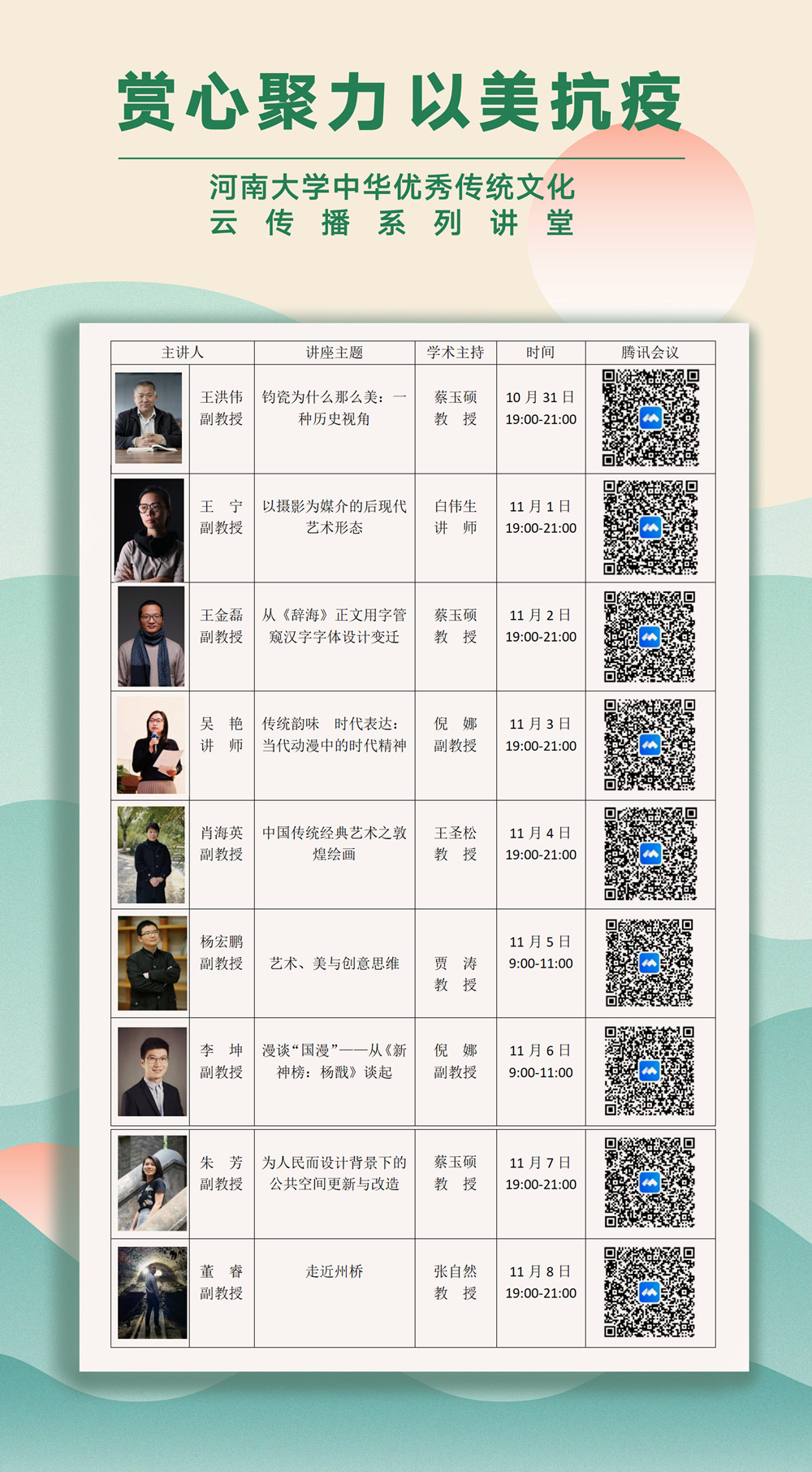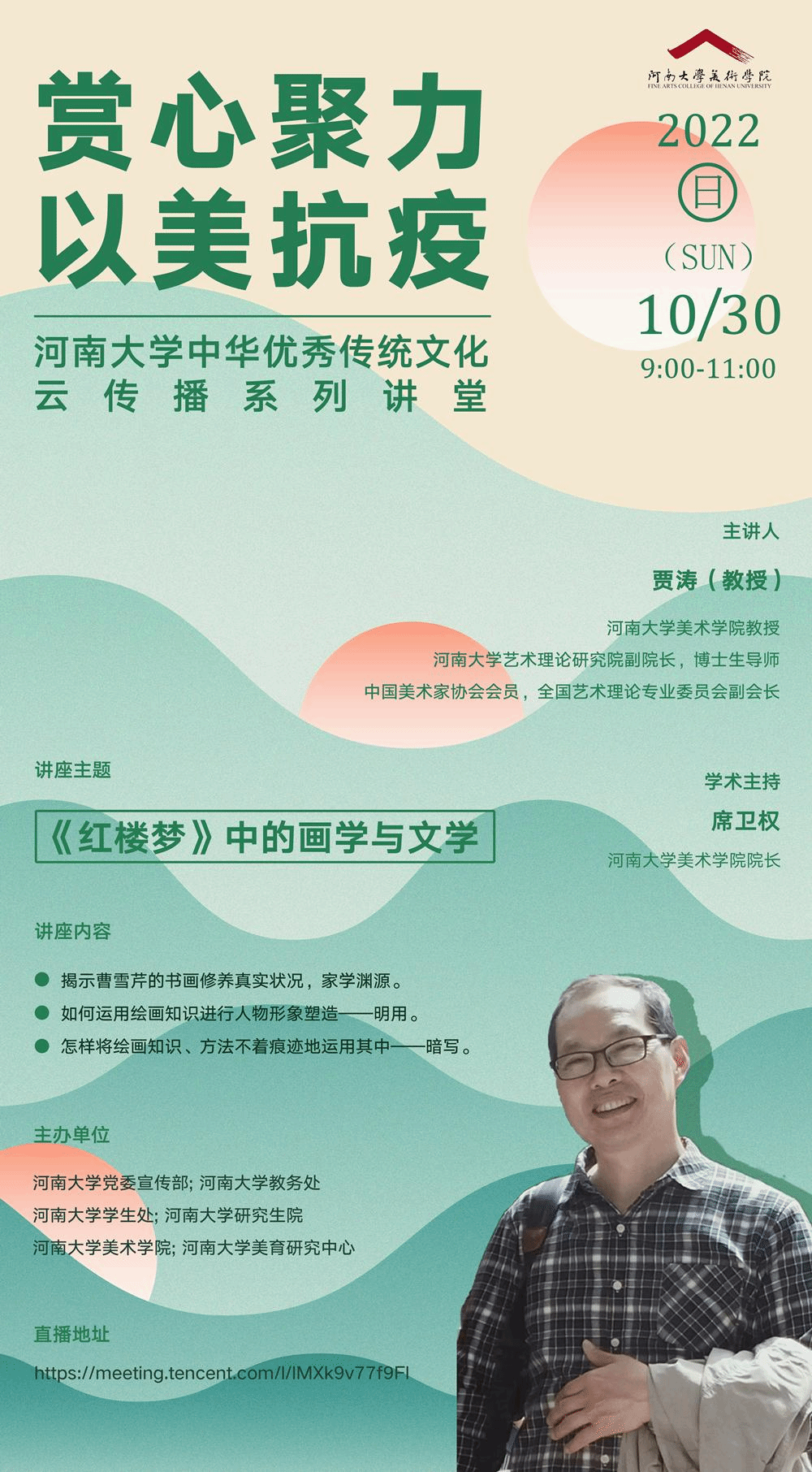 10月29日-11月8日,“賞心聚力、以美抗疫——河南大學(xué)中華優(yōu)秀傳統(tǒng)文化云傳播系列講堂”開講啦!十位河南大學(xué)美術(shù)學(xué)院的老師與“你”相約云端,意會古今,溫馨暢神。讓我們靜下心來,共同開啟一場中華優(yōu)秀傳統(tǒng)文化的大美之旅;讓我們一起努力,弘揚中華優(yōu)秀傳統(tǒng)文化,鑄就社會主義文化新輝煌!