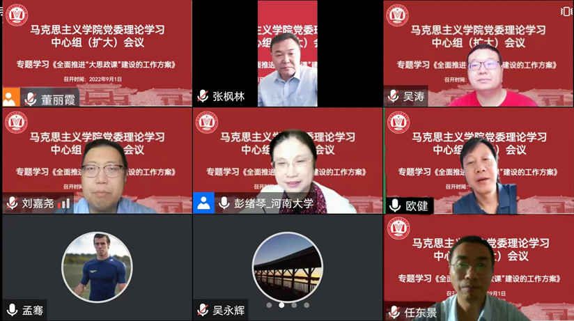 9月1日上午,馬克思主義學(xué)院在線上召開(kāi)黨委理論學(xué)習(xí)中心組擴(kuò)大會(huì)議,專題學(xué)習(xí)教育部等十部門印發(fā)的《全面推進(jìn)“大思政課”建設(shè)的工作方案》(以下簡(jiǎn)稱“工作方案”),學(xué)院全體黨委委員、領(lǐng)導(dǎo)班子成員,各系、室主任,全體行政人員參加會(huì)議,會(huì)議由學(xué)院黨委書(shū)記彭緒琴主持。