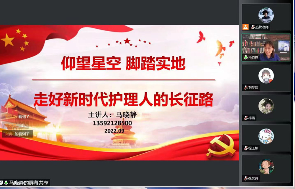 9月4日上午,為引導(dǎo)2022級本科新生正確認(rèn)識“小我”和“大我”,激勵同學(xué)們將榮校、愛國、報國作為奮斗目標(biāo),護(hù)理與健康學(xué)院黨委書記馬曉靜為2022級新生作題為《仰望星空腳踏實(shí)地——走好新時代護(hù)理人的長征路》的講座,全體2022級本科新生線上參會,會議由2022級本科輔導(dǎo)員熱孜萬古麗·黑木都老師主持。