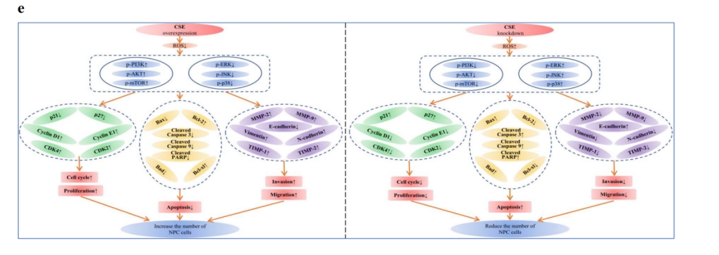 鼻咽癌是一種具有獨(dú)特地理分布的惡性腫瘤。課題組研究發(fā)現(xiàn),與人正常鼻咽上皮細(xì)胞相比,人鼻咽癌細(xì)胞中的CSE(一種內(nèi)源性硫化氫生成酶)表達(dá)水平升高,CSE過(guò)表達(dá)促進(jìn)鼻咽癌細(xì)胞增殖、遷移和侵襲,而抑制CSE表達(dá)具有相反作用。進(jìn)一步研究揭示,CSE能夠通過(guò)ROS介導(dǎo)的MAPK和PI3K/AKT/mTOR信號(hào)通路促進(jìn)鼻咽癌細(xì)胞生長(zhǎng),CSE可能是鼻咽癌診斷和預(yù)后的一種新的腫瘤標(biāo)志物。