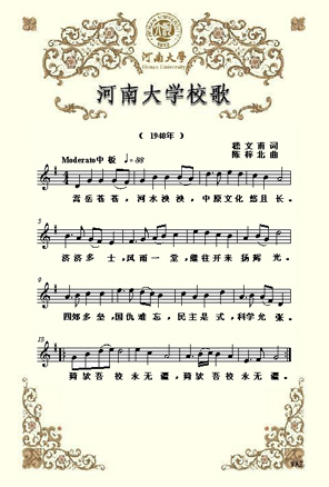 "四郊多壘,國(guó)仇難忘。"日寇的暴行,并沒(méi)有嚇倒河大人。"濟(jì)濟(jì)多士"在蒼蒼嵩岳下,泱泱黃河邊,"風(fēng)雨一堂",堅(jiān)守"悠且長(zhǎng)"的"中原文化",追求民主與科學(xué),為抗戰(zhàn)和建設(shè)培養(yǎng)人才。此后一代又一代的河大人高唱校歌,奮發(fā)圖強(qiáng),傳承河大精神,創(chuàng)造出河南大學(xué)的輝煌歷史。